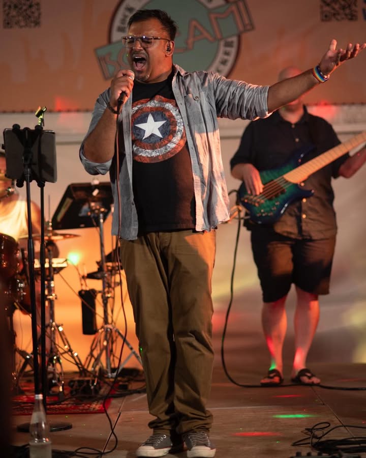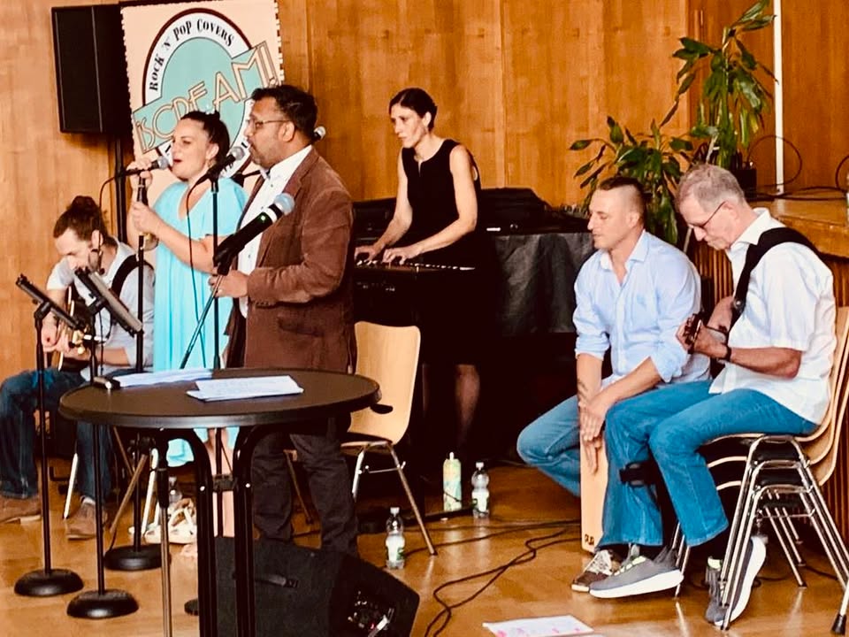 Vorne am Mikro: Jennifer Gion und Siby Kuttikattu – zwei Stimmen, die zusammen einfach zünden! Was auf die Ohren gibt’s reichlich: Von 80er-Klassikern über 2000er-Partyhits bis zu modernen Songs à la Lady Gaga oder David Guetta – aber alles schön mit Gitarre, Groove, ordentlich Wumms, und dem charmantesten Keyboard der Rockgeschichte.